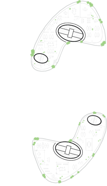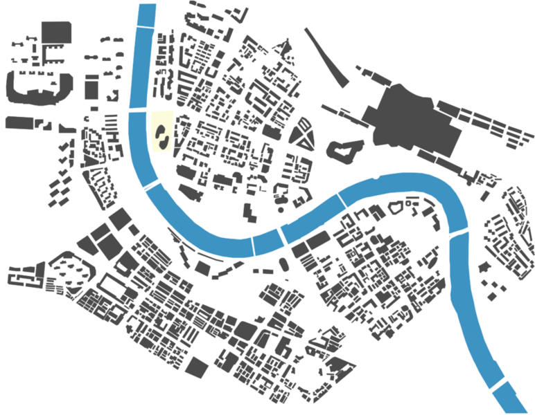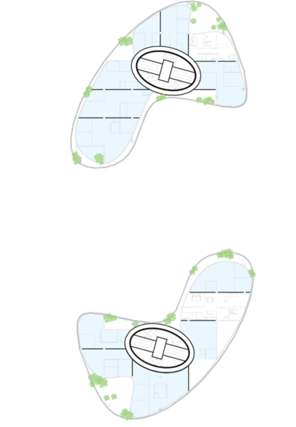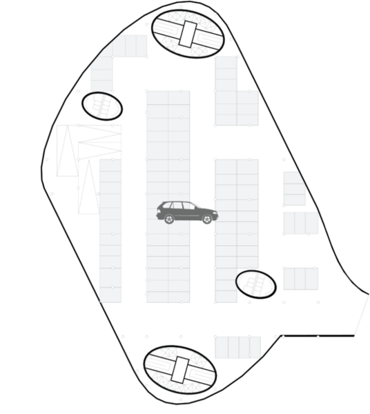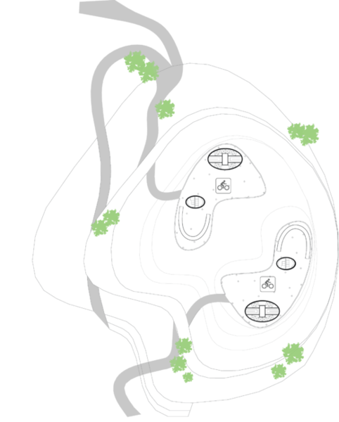 Die Erdgeschoßzone und die öffentliche Außenzone wurden zu einer öffentlichen, architektonischen Landschaft gestaltet. Zur Straße im Osten hebt sich das Grundstück etwas an, um den Lärm abzuschirmen. Zum Flussufer hin wird diese Erhöhung abgestuft und ermöglicht so einen angenehmen Zugang zum Gebäude für Fußgänger und Radfahrer. Die Abstufung des Geländes lädt durch Sitzstufen ein sich einen Augenblick zu setzen und die Aussicht auf den Fluss zu genießen. Radfaher können die landschaftliche Geländeform unterfahren oder auch mittels Rampen befahren und direkt in die Fahrradgarage im ersten UG des Gebäudekomplexes abstellen.