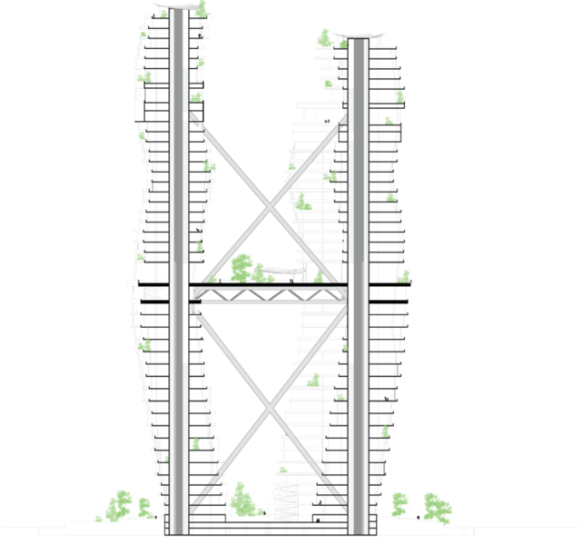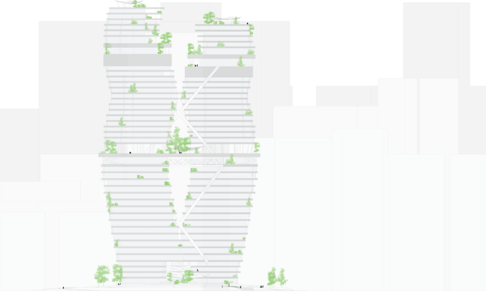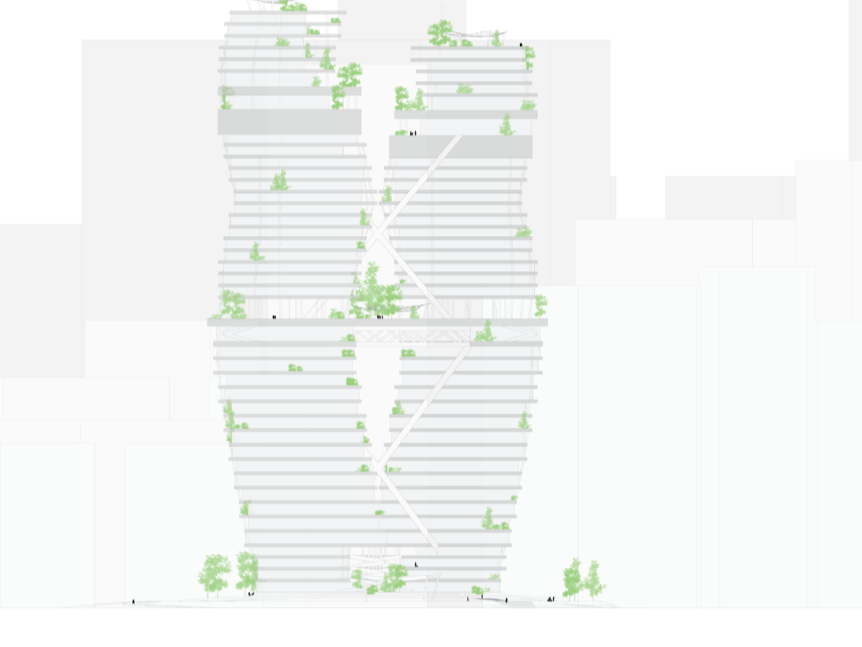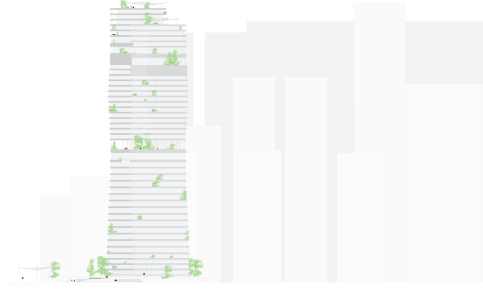 Ein wichtiger Faktor des Konzepts ist die Nachhaltigkeit. Sichtbar gemacht wird sie duch die begrünte Fassade und zahlreiche öffentliche, private und halböffentliche Grünräume. Des weiteren gibt es wie beschrieben die Möglichkeit der Regenwassernutzung als Brauchwasser und der natürlichen Belüftung. Durch die großzügige Begrünung wird ebenfalls ein Anteil an produziertem CO2 absorbiert. Dabei stehen dem Komplex auch noch die Nutzung der Solaren Energie und der Wasserkraft offen.